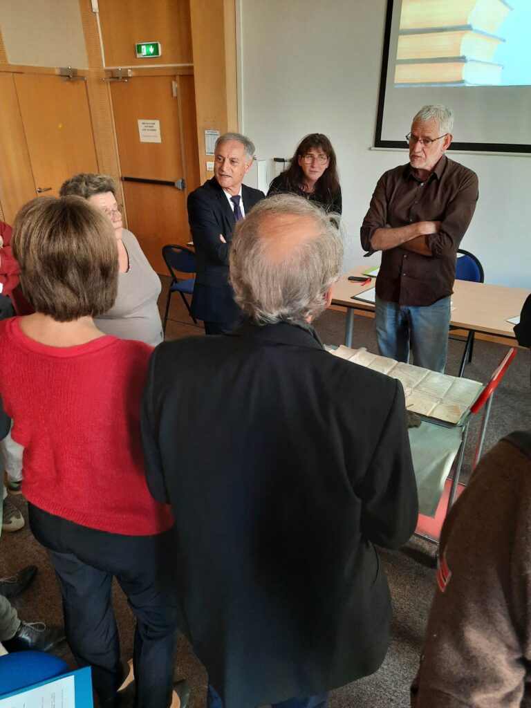 Après cet accueil, monsieur Labadie a rappelé à toutes et tous les notions fondamentales des archives. Il a également précisé les responsabilités de chacun en matière d’archivage, ainsi que les modalités de demandes de subventions auprès de la DRAC (Direction Régionale des Affaires Culturelles) pour le classement des archives ou encore la restauration de registres.