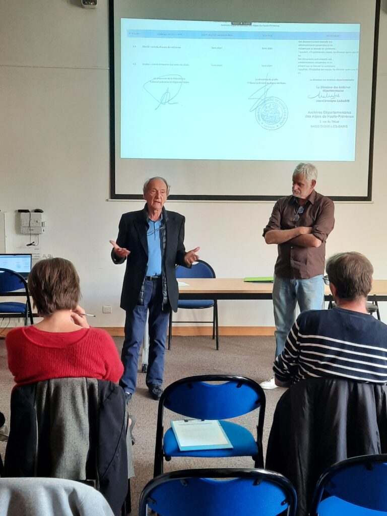La journée s’est clôturée par l’intervention de monsieur Mathias Fusco-Blanc, responsable des archives communales aux Archives départementale. Il est revenu sur les intérêts patrimoniaux et historiques des archives communales et a également présenté le tableau de gestion des archives relatives à l’état-civil rédigé au cours de l’année 2025 par les Archives départementales en coopération avec le greffe du Tribunal Judiciaire de Digne-les-Bains.